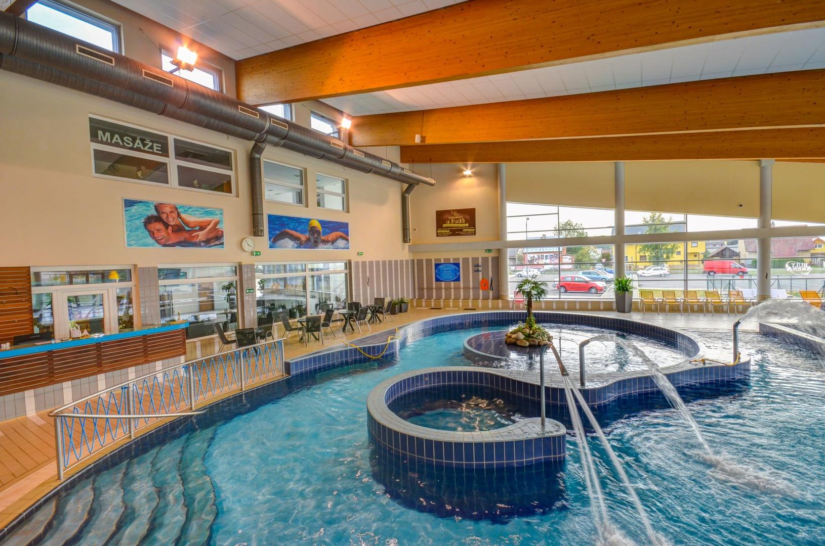 Po schodišti je přístup k atrakci whirlpool. Whirlpool je určen pro 6 osob. Teplota vody dosahuje 34 ºC. V další části bazénové haly se nachází dva bazénky pro děti s vodním hřibem. Hloubka vody v těchto bazénech je 40 a 60 cm. Teplota vody je 30 ºC. 65 metrů dlouhý tobogán, vedený venkovním prostorem, je přístupný po schodišti.